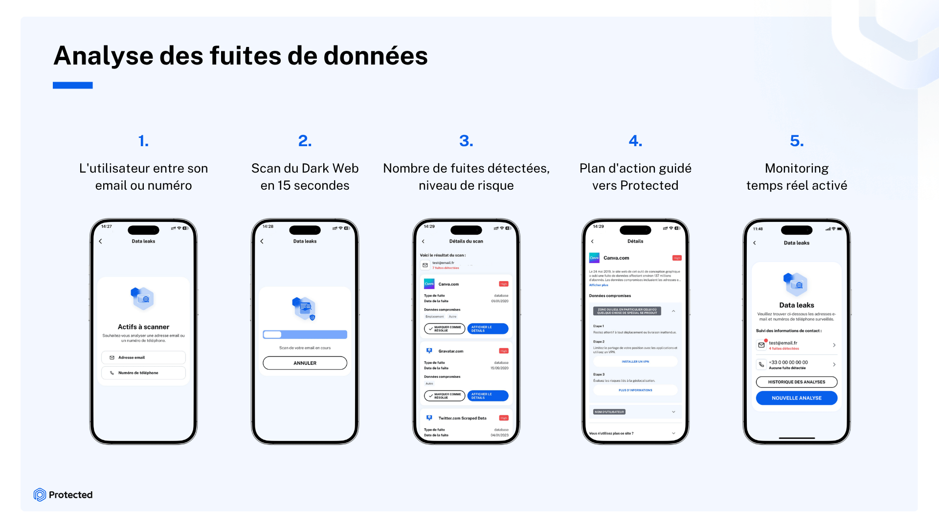 Reprendre le contrôle commence par un état des lieux de votre présence numérique. La solution Protected intègre une technologie native de veille de fuites de données qui analyse les bases de données compromises et vous partage l'origine de ces fuites lorsqu'elles sont observées.